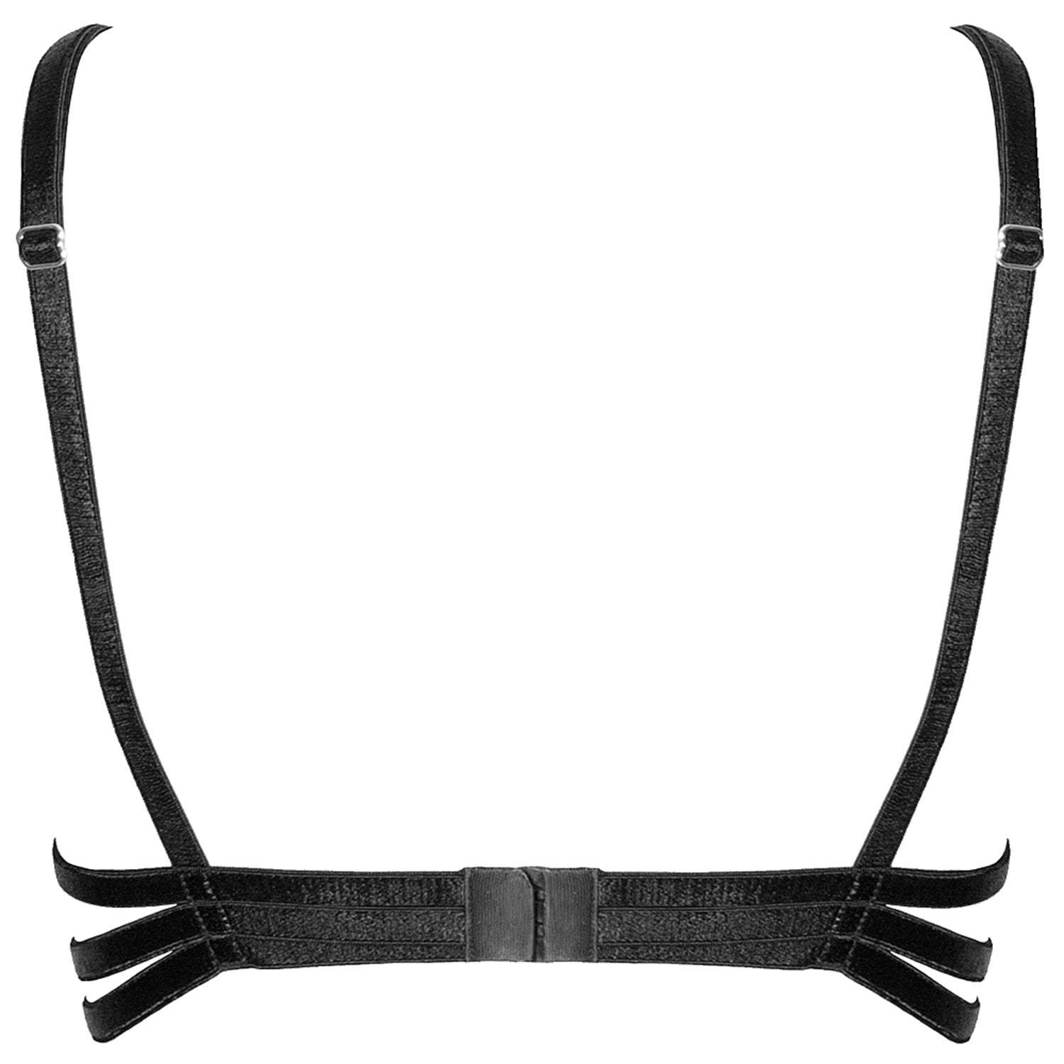 This graphic bra shape is a signature Karolina Laskowska style, reimagined in a stunning metallic black French lace. This bra style has a cut away cup design with decorative overbust strapping and a neckline trim of fine cotton leavers lace. The signature bra wings are made from strips of adjustable satin elastic with silver toned components, allowing the wearer to fit the garment to their preferences. The bra is lined in a sheer black tulle for additional support.