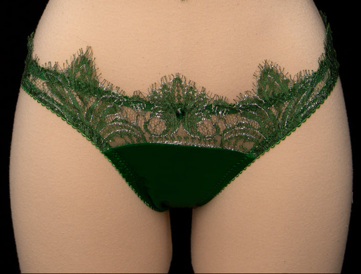 A low rise brief hand-dyed green and silver French Leavers lace, with emerald green silk panelling. It is trimmed with hand-dyed green trims, and finished with a vintage Swarovski crystal pendant.
