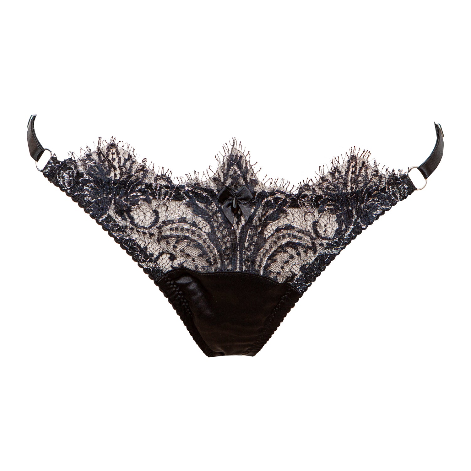 This low-rise tanga cut has placement cut lace along the front waistline, leading to black silk satin in the gusset and seat. The silk knicker seat is crafted with flattering ruching through the centre back. Satin strapping is adjustable at the hips with silver toned components, and the knicker is finished with a delicate satin bow and jet crystal droplet.