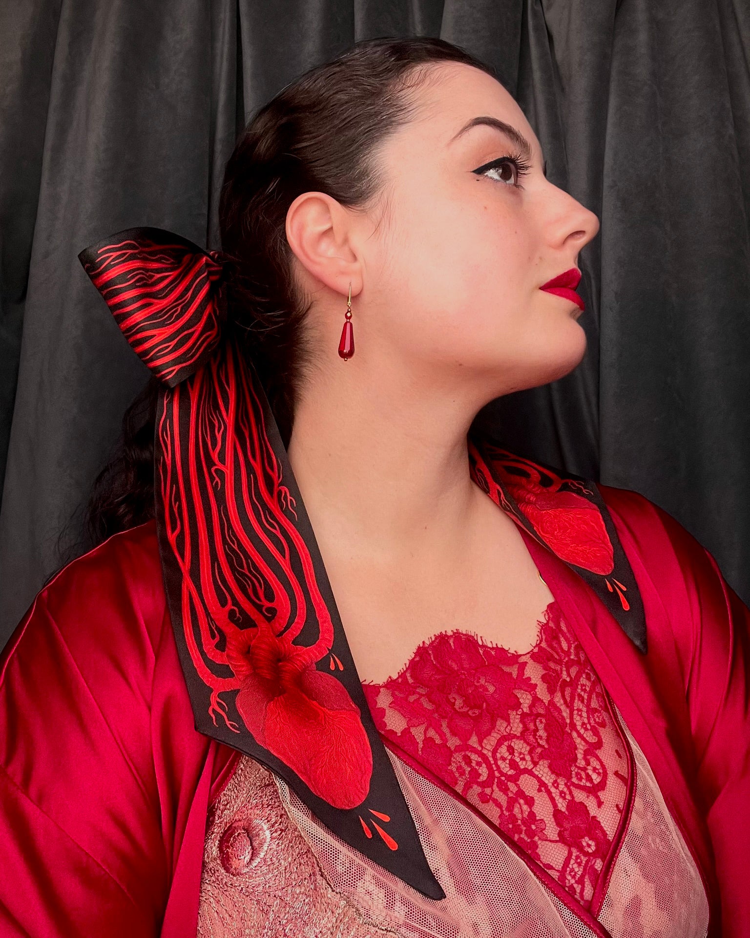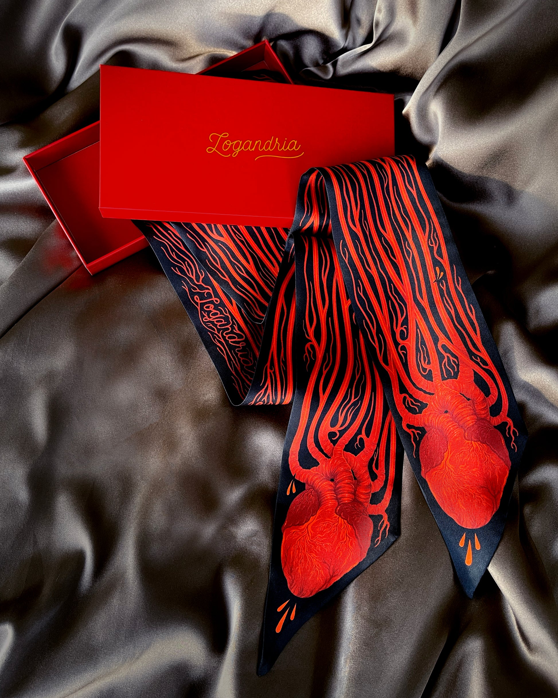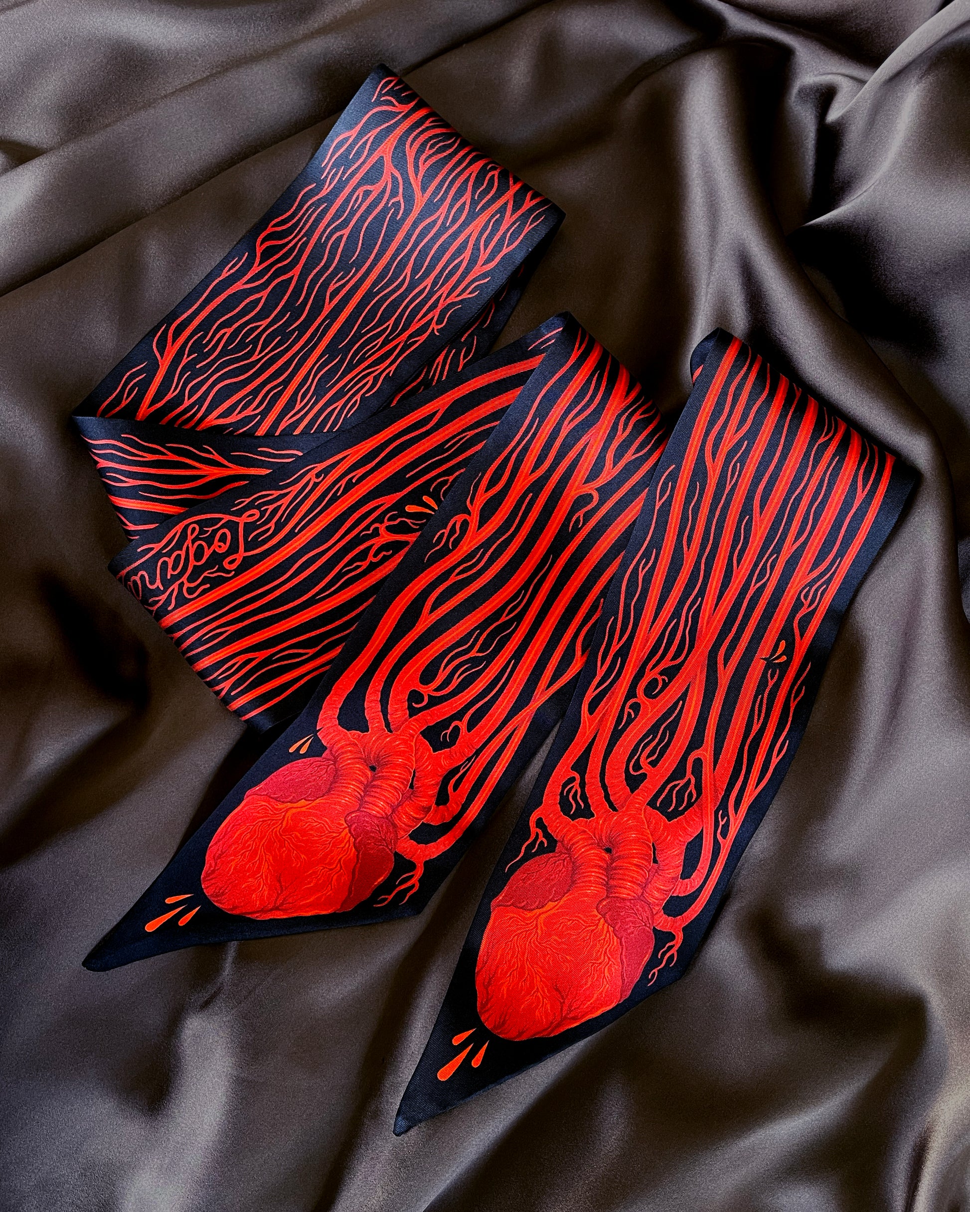 On a background of void-black, twin bleeding hearts occupy opposing ends of this long slender scarf, pulsing with adoration for one another. From forth this pair of star-cross’d lovers, their veins and arteries reach out towards the other, finally embracing in the center. Along the way, little jewel-like droplets of blood are lost from little nicks and cuts, barely noticed by the lovers in their fervor.