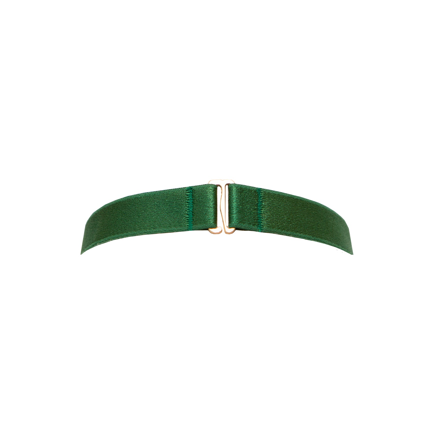 A striking choker in hand-dyed, green satin elastic, with gold plated components and a green biwa freshwater pearl charm that has been edged with gold plate. Please note that there may be variation in the exact size and shape of the pearl charm.