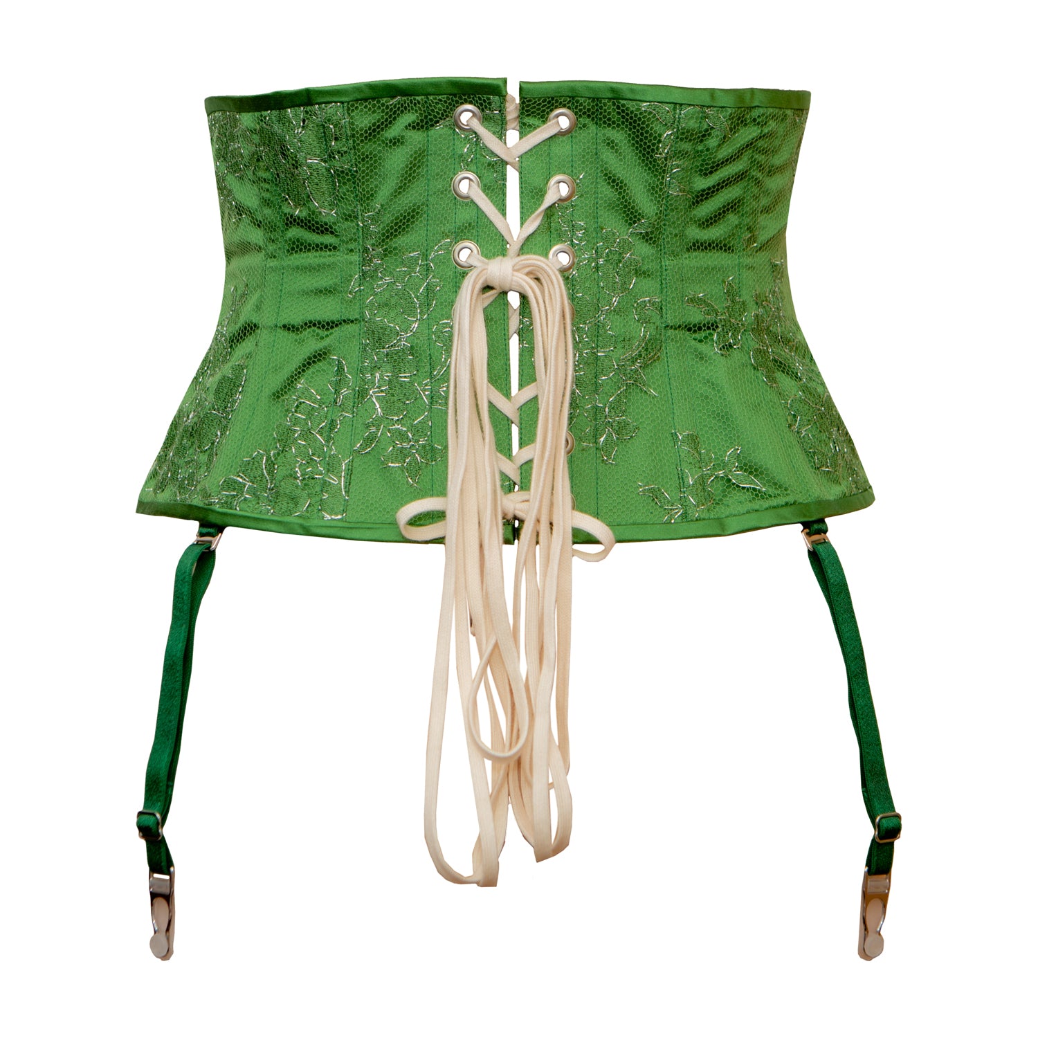 This style is structured with cotton coutil lining and a mix of flat steel and synthetic baleen polymer bones steel bones. Silver toned eyelets are laced with sturdy cotton lacing. There are four removable suspender straps, in hand-dyed green elastic with silver toned hardware.