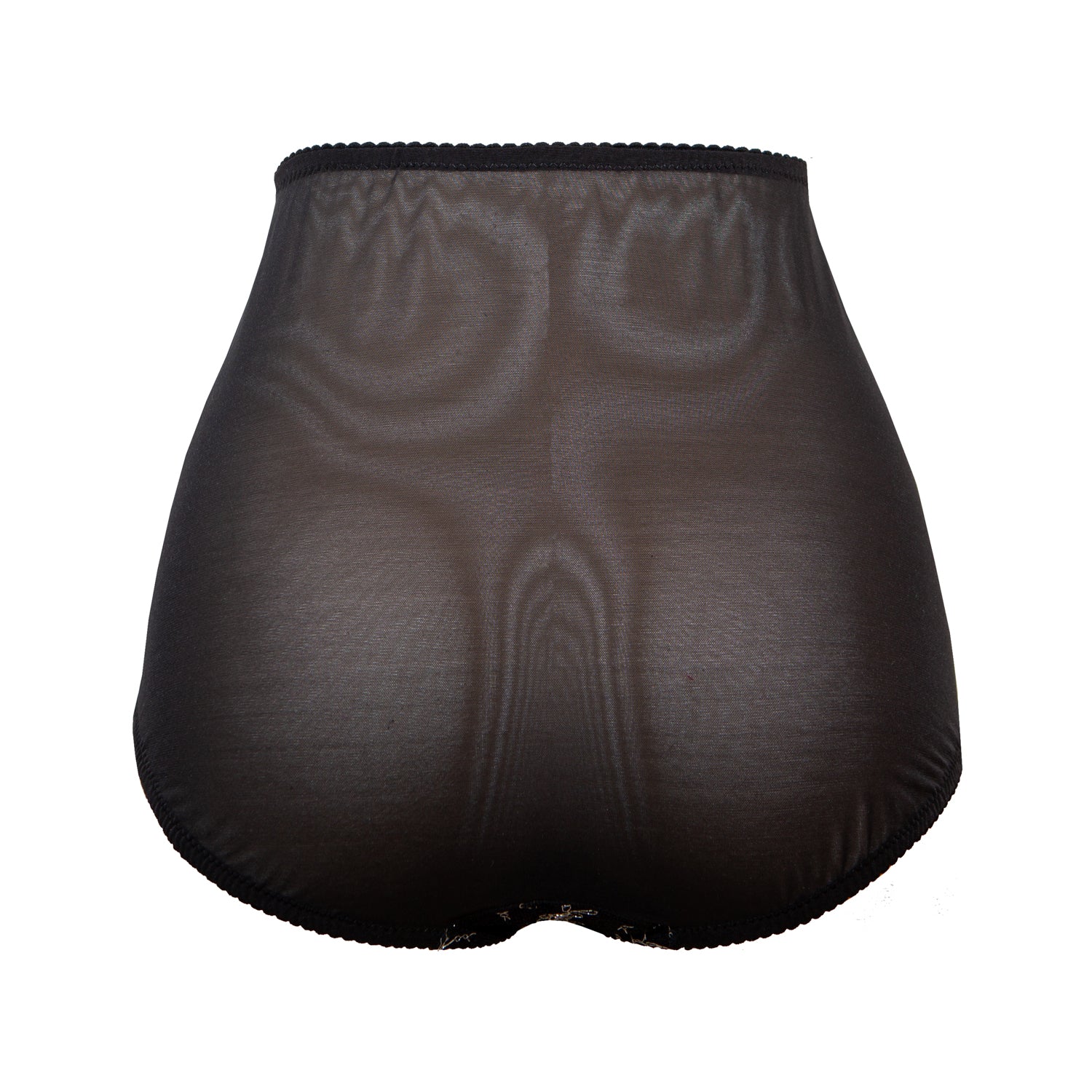 A vintage-inspired, full cut brief. The centre front panel showcases an exquisite French chantilly lace, in black and silver tones, with a black tulle lining. The knicker seat is made from a soft, sheer stretch mesh. Trimmed with plush elastic and a gusset lined with cotton.