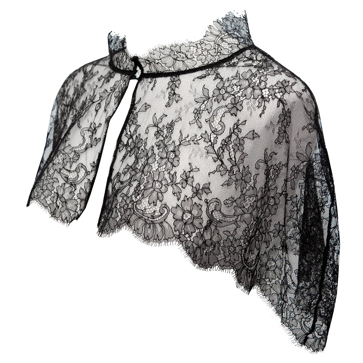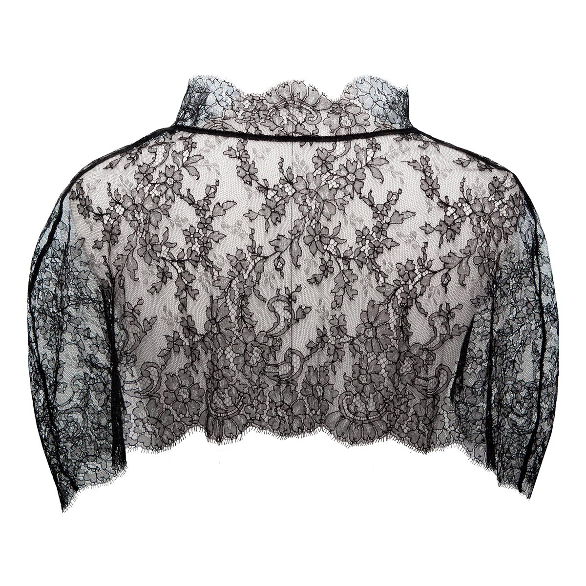 A delicate capelet in fine French chantilly lace. The delicate scalloped edge has been pattern matched across the hem, and trims the collar. Fastens with a clear Swarovski crystal button and silk loop at the neck. Perfect styled with either lingerie or evening wear.