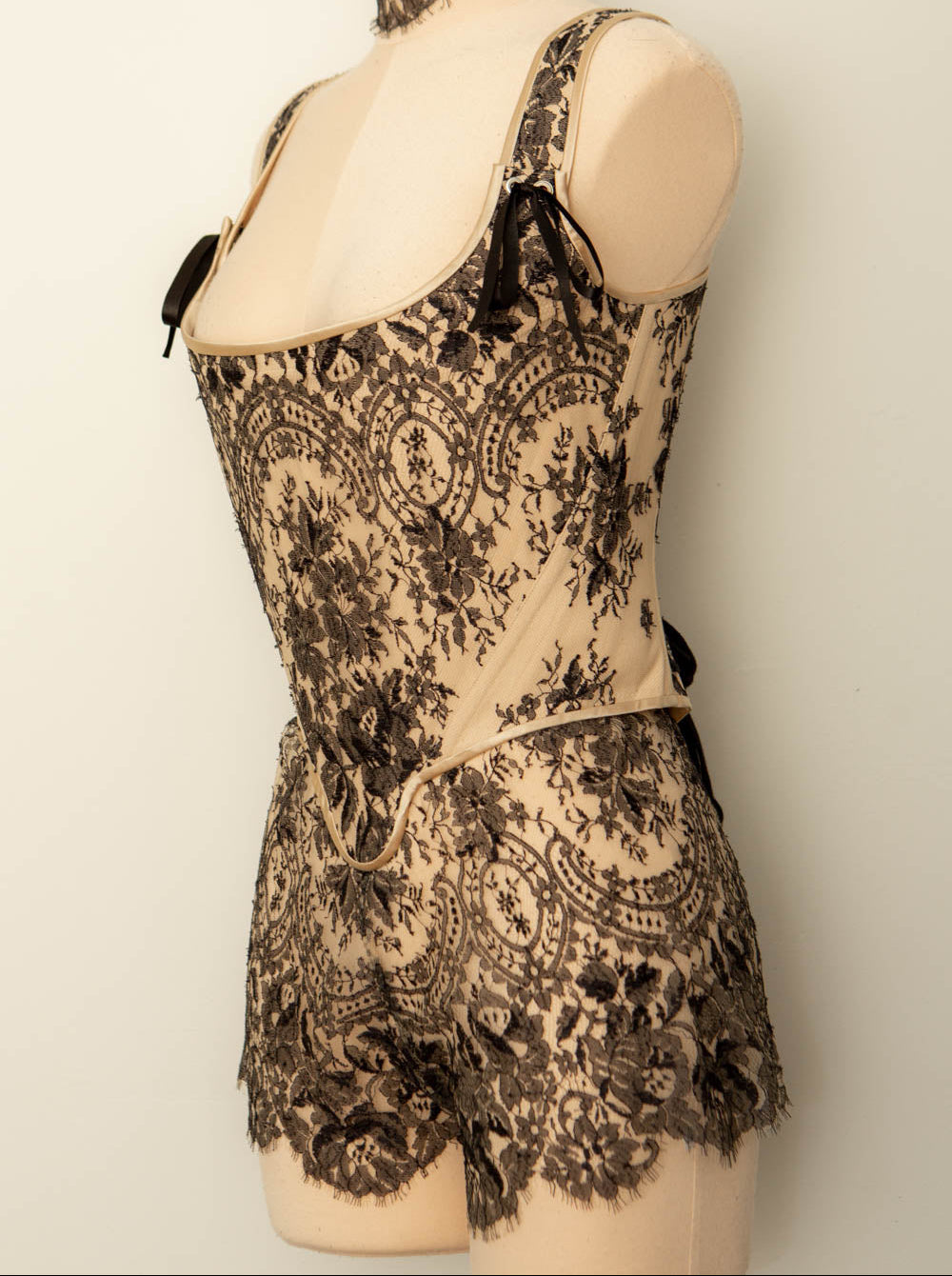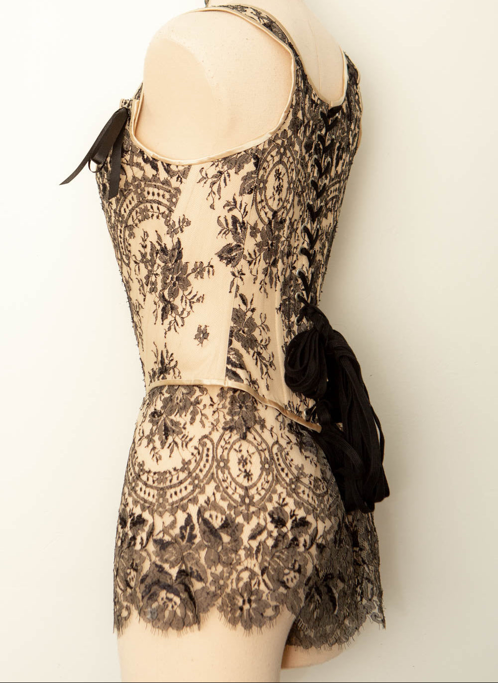 The sample for last year's Patreon exclsusive corset design, inspired by 18th century stays. The stays are crafted from a beige cotton coutil, with a fine French Chantilly lace overlay in black and beige. It is finished with a hand-stiched, beige silk duchesse satin binding. The shoulder straps are adjustable with metal eyelets and satin ribbon, and the garment fastens at the centre back with cotton lacing through 2-part metal eyelets. It is structured with a mix of flat steel and synthetic baleen bones.