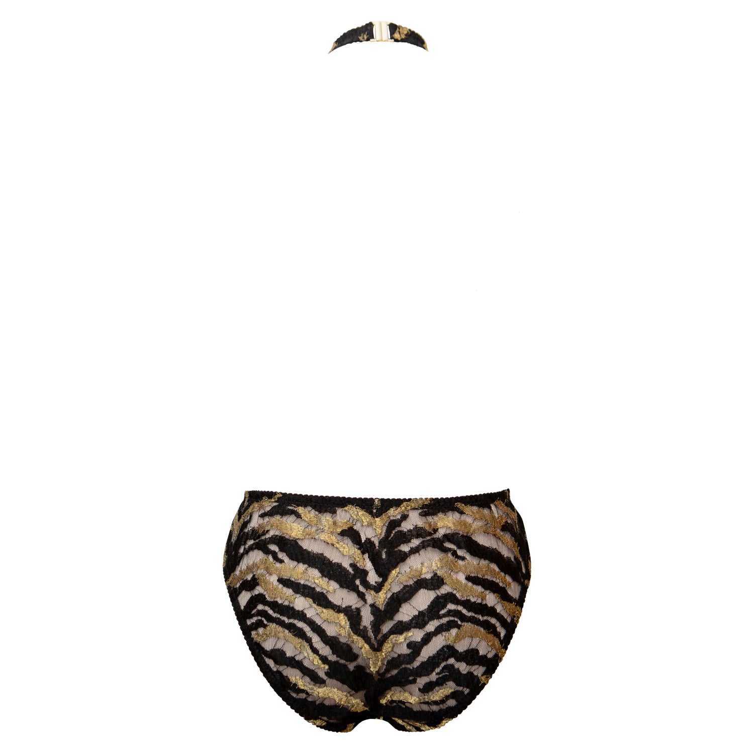 This dramatic playsuit is inspired by a 1940s cabaret costume, designed by the legendary Erté. It's been reimagined in a luxury French lace with a tiger stripe motif. A brief cut leads to a halterneck harness, with adjustable satin strapping and gold plated hardware. The brief is trimmed with plush elastic, with a cotton gusset lining.